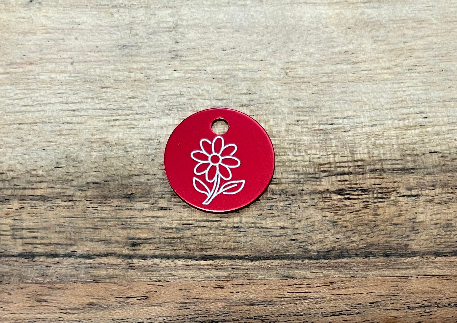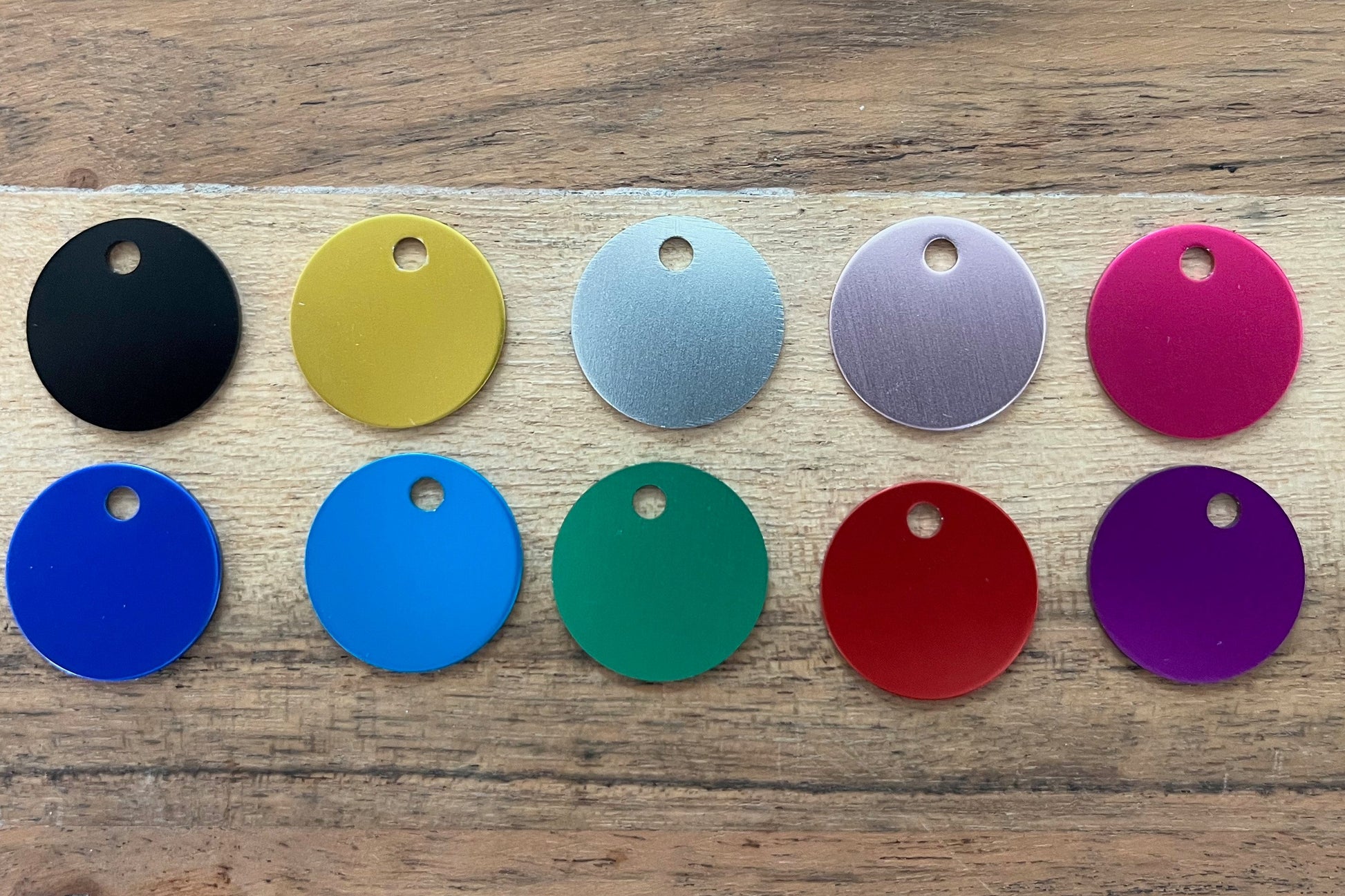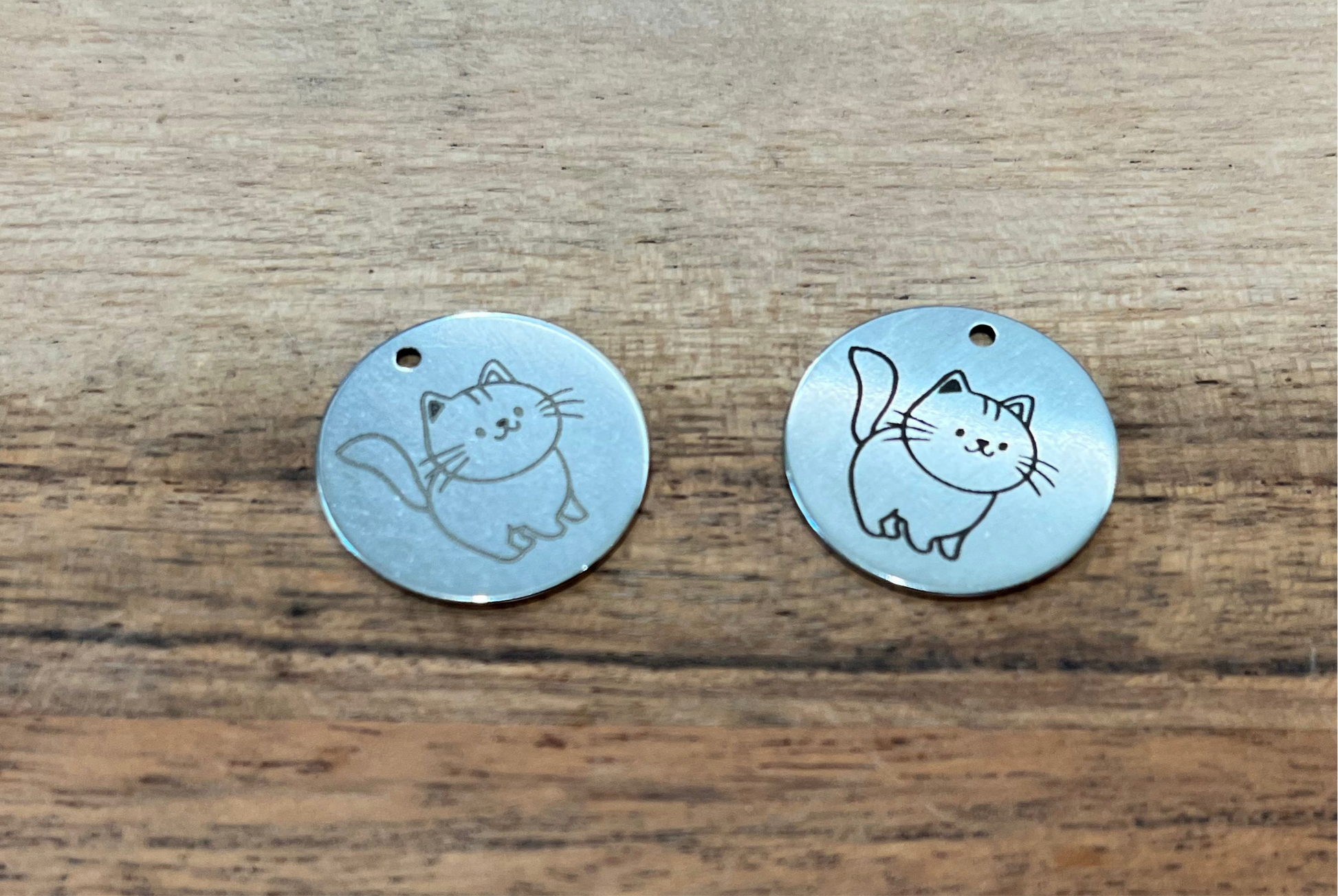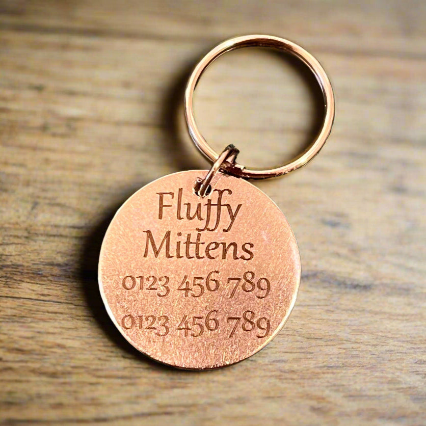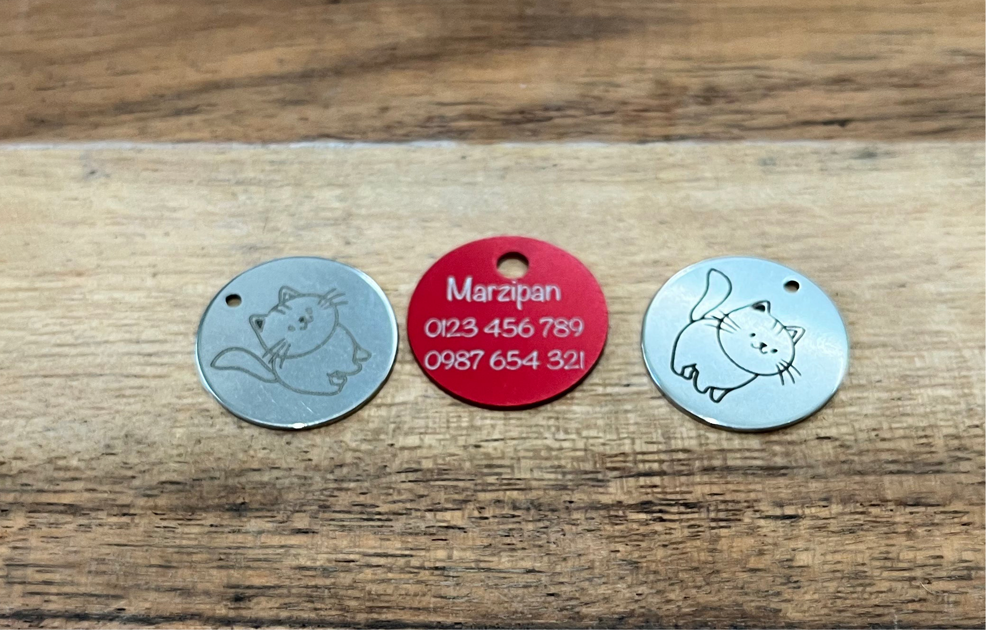 Choose from a variety of cute engraved designs on a 20mm coloured metal tag, perfect for your kitty cat or little pup.