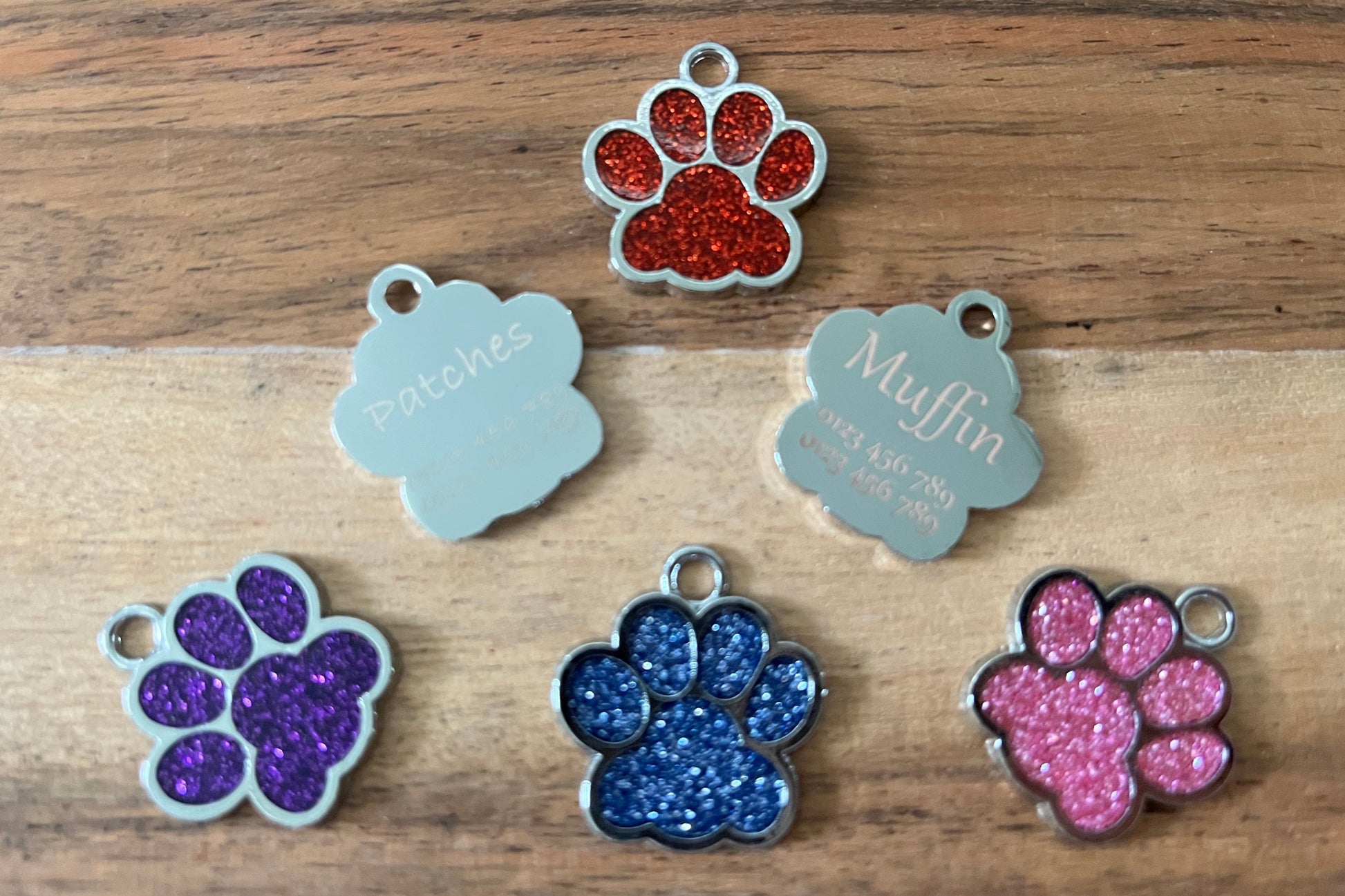 Enhance your pet's style and identity with our Glitter Paw Print Tag! This tag features a personalised laser engraved name and number on the back for easy identification. Available in eleven vibrant colours, it's the perfect accessory for cats and dogs everywhere.