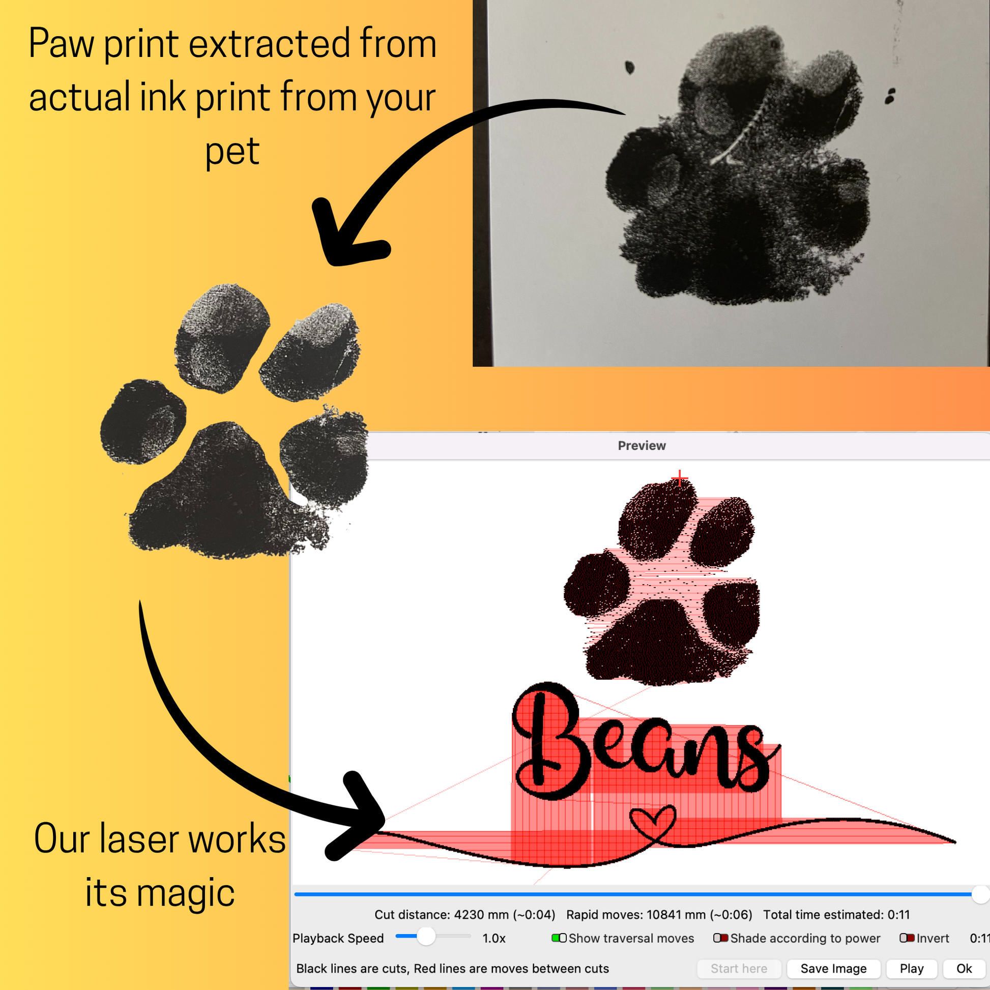 Send us a photo of your pet's paw print and we will engraved it on a keyring of your choice. Include their name and a date if you so wish.
